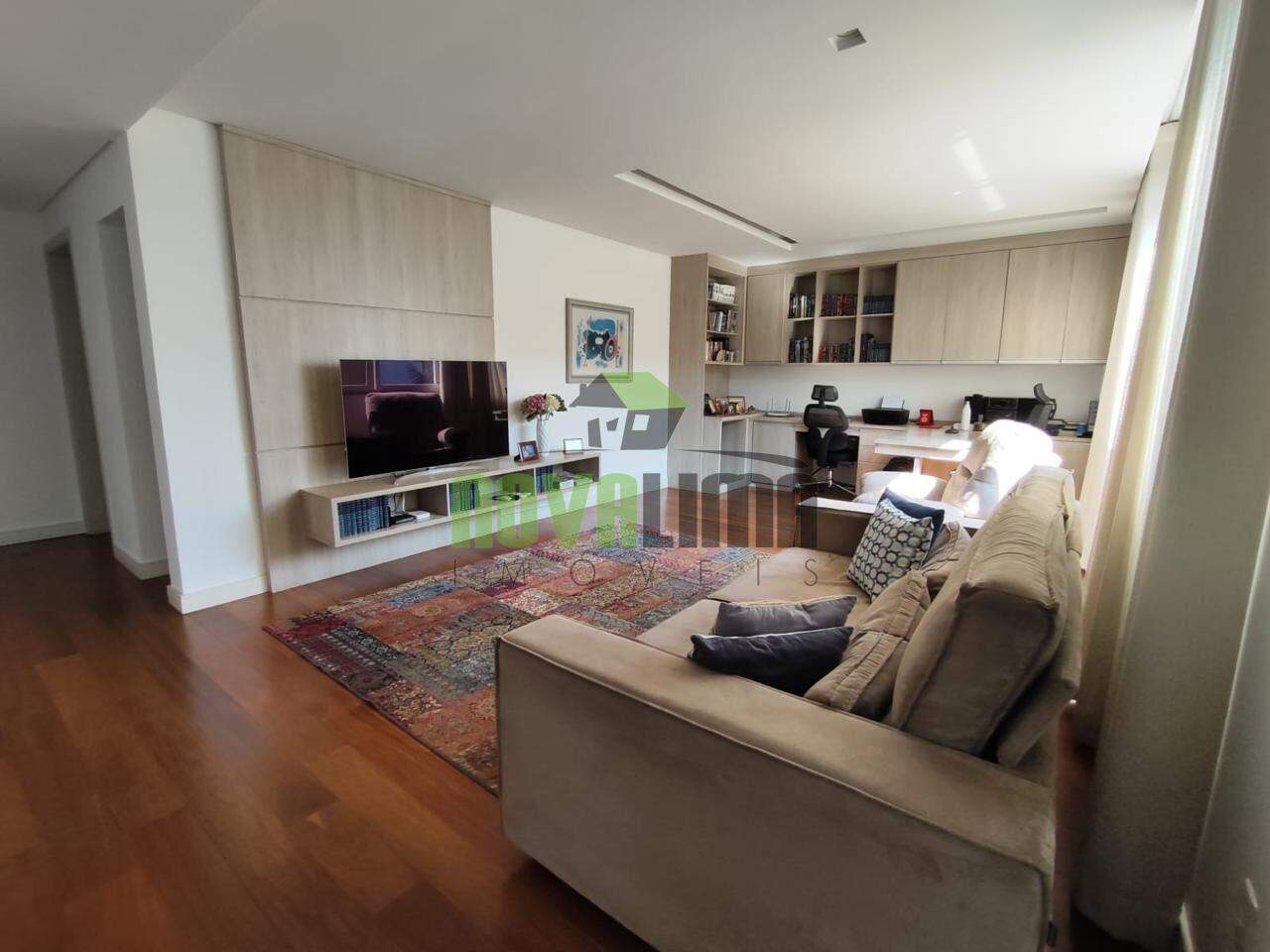 A sala de estar, com lareira e home cinema, é ideal para momentos de relaxamento e entretenimento. A cozinha, completa e funcional, conta com despensa e dependências completas para funcionários, garantindo praticidade no dia a dia.